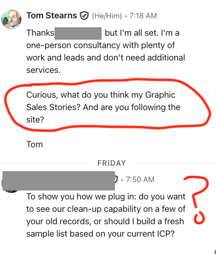 (I got 10 messages from this person, btw, but I just grabbed the first which cited something that “impressed” them and asked them about it. Easy layup to respond to if you’re a human and paying attention.)