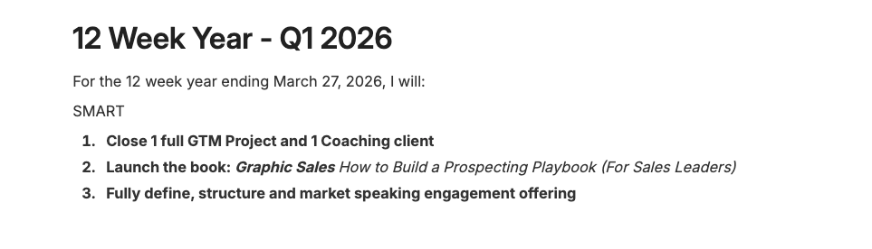 Back in 2012, when I was running a GTM team, my boss, Peter Weyman, handed me The 12 Week Year and told the team to use it. Not a book plug—just a method that stuck. We didn’t execute it perfectly, but it permanently changed how I plan.