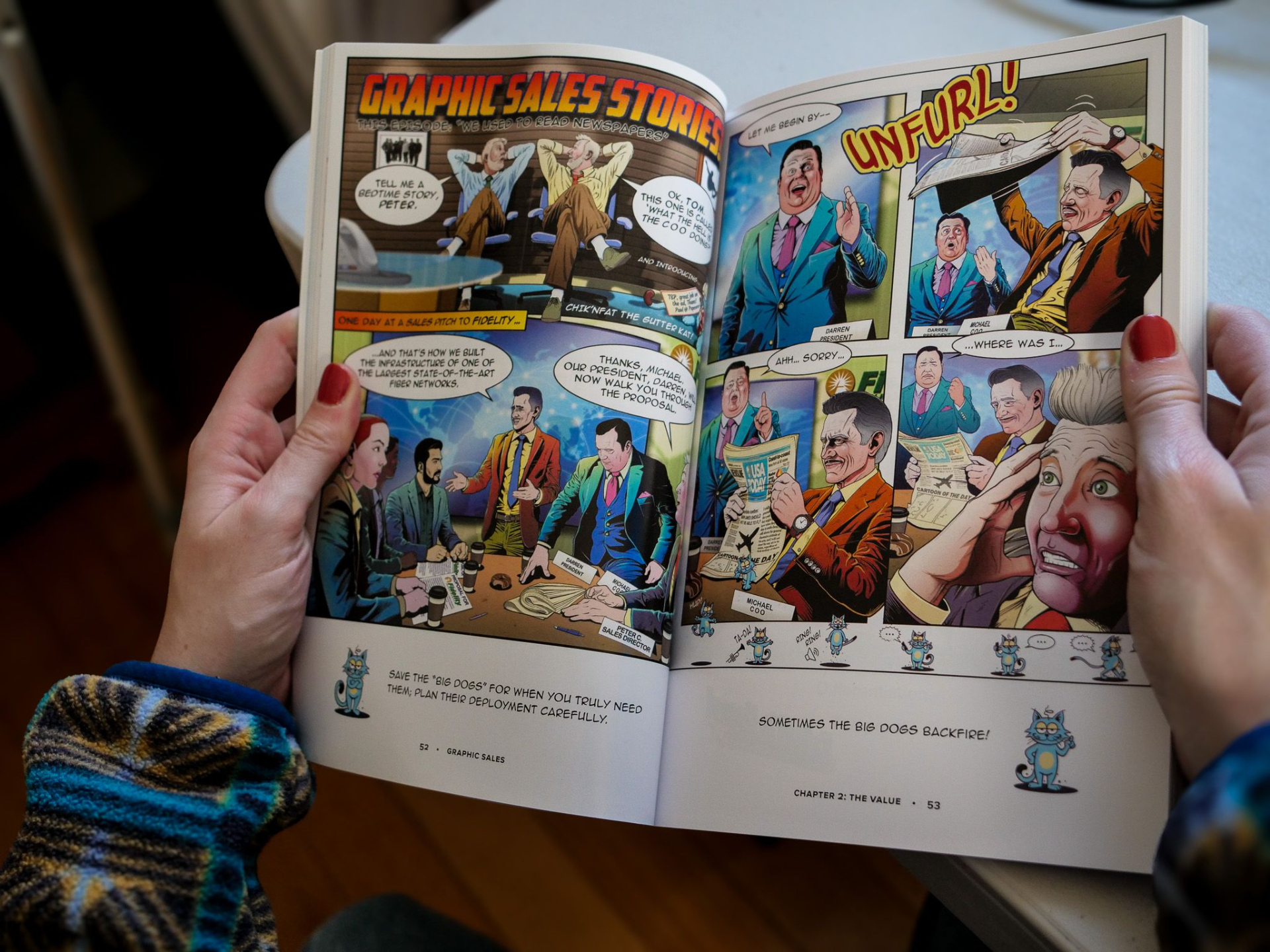 Each chapter starts with a comic—yes, really, it’s a graphic novel!—then breaks down what to do, why it matters, and how to implement your strategy. Complete with templates, real client examples, and even AI prompts, Graphic Sales helps your team move faster without sounding like robots.